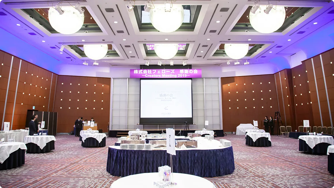 決算期を終えた4月に全社員が東京に集まり、前期を振り返る会議を開催。会議後はパーティー会場を貸し切り、決起の場として盛大に交流します。